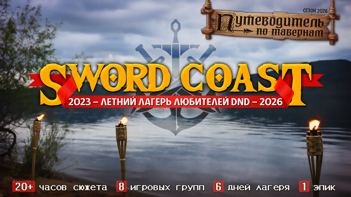 Летний лагерь любителей D&D «Sword Coast» — это незабываемый отдых на побережье волжского полуострова, манящего песчаными пляжами и поистине уникальными впечатления как для новых, так и для опытных игроков! Участники лагеря приезжают отдохнуть, познакомиться с единомышленниками, найти новых друзей и встретиться со старыми, играя во всемирно известную настольную ролевую игру Dungeons & Dragons. Лучшие Мастера подземелий со всей России проводят игроков через многодневную авторскую кампанию в сеттинге Забытых Королевств, кульминацией которой каждый год становится эпическое приключение (D&D Epic) на множество столов одновременно!